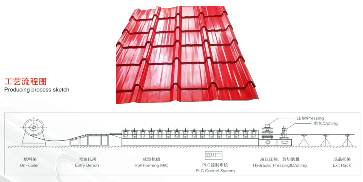 彩钢琉璃瓦设备主要由放料机、进料导入平台、成型主机、冲模压型装置、成型剪切装置、液压站、电脑控制系统、成品托架等几部分组成。